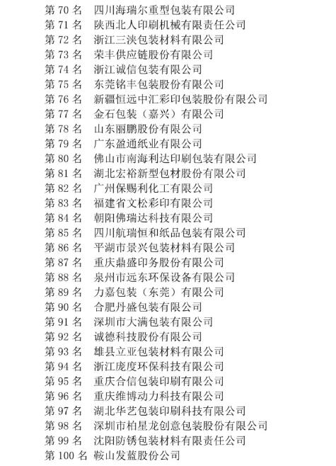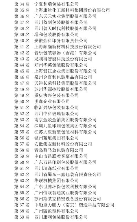名单最后的30家包装企业中,纸质包装企业数量占据三分之一以上,包括浙江三浃、新疆恒远中汇彩印、福建文松彩印、四川航瑞恒和纸品、平湖市景兴包装、力嘉包装、合肥丹盛、重庆合信、重庆维博动力、湖北华艺、深圳柏星龙等企业。