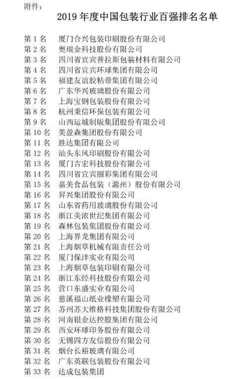 由于该项活动坚持自愿申报、免费参与的原则,裕同科技、旺盈集团、祥恒包装、胜源集团、金美集团、格美包装、济丰包装等部分有实力上榜的企业,可能因为没有进行申报,而未被列入榜单之中。名单排序的依据是主营业务收入专项数据,毫无意外,2019年营收逾110亿元的厦门合兴包装高居第一。
