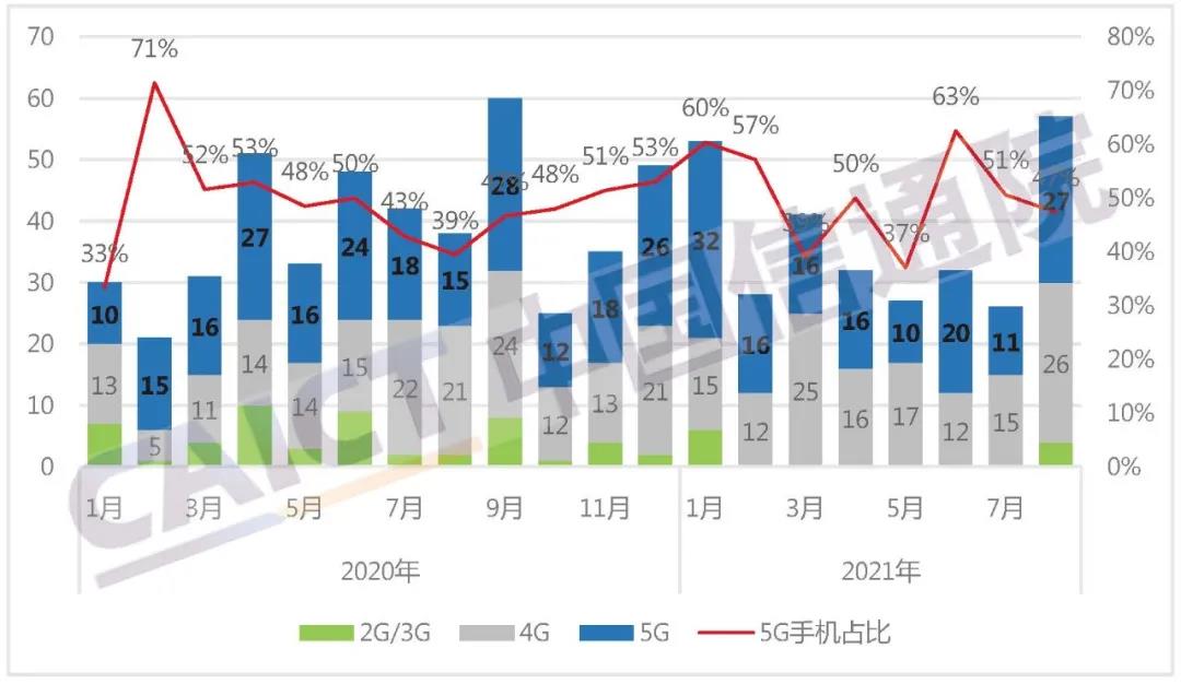 2021年8月,国内手机上市新机型57款,同比增长50.0%,其中5G手机27款,同比增长80.0%,占同期手机上市新机型数量的47.4%。