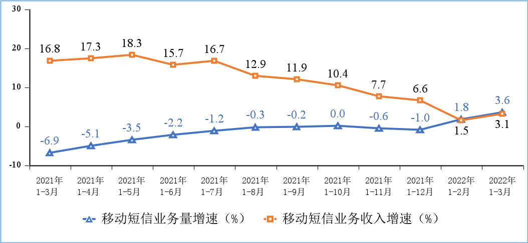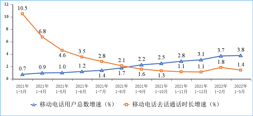 移动电话通话量低速增长,移动短信业务量收均增长。一季度,移动电话去话通话时长完成5445亿分钟,同比增长1.4%;固定电话主叫通话时长完成197亿分钟,同比下降12.8%。一季度,全国移动短信业务量同比增长3.6%;移动短信业务收入同比增长3.1%。