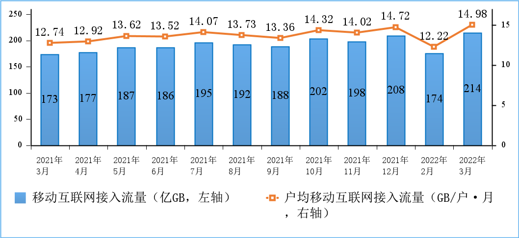 移动互联网流量较快增长,3月DOU值创新高。一季度,移动互联网累计接入流量达587亿GB,同比增长21.8%。截至3月末,移动互联网用户数达14.4亿户,比上年末净增1985万户。3月当月户均移动互联网接入流量(DOU)达到14.98GB/户·月,同比增长17.6%,比上年底高0.26GB/户·月。