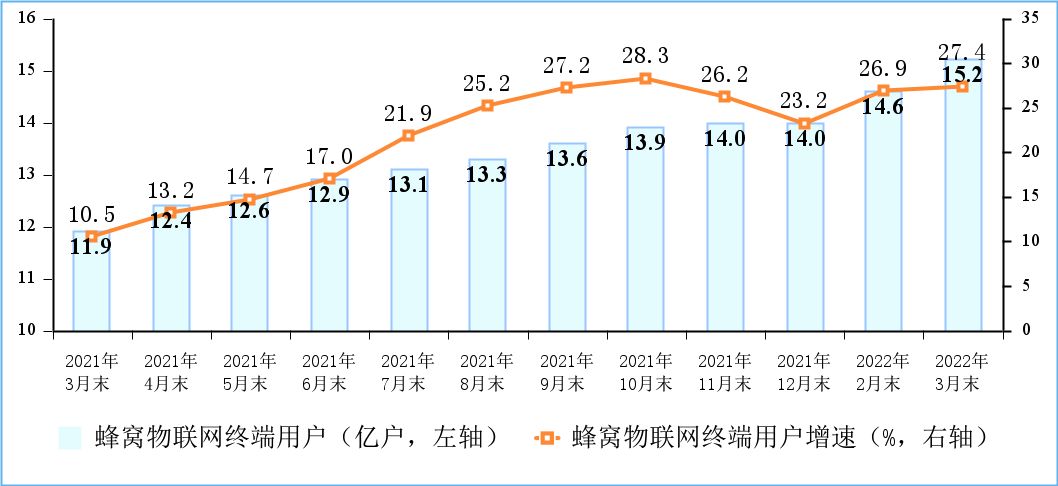 蜂窝物联网用户增长较快,IPTV用户稳步增加。截至3月末,三家基础电信企业发展蜂窝物联网终端用户15.2亿户,比上年末净增1.19亿户;蜂窝物联网终端用户规模快速接近移动电话用户,两者规模差缩小至1.4亿户,占移动网终端连接数(包括移动电话用户和蜂窝物联网终端)的比重已达47.7%。IPTV(网络电视)总用户数达3.6亿户,比上年末净增1121万户。