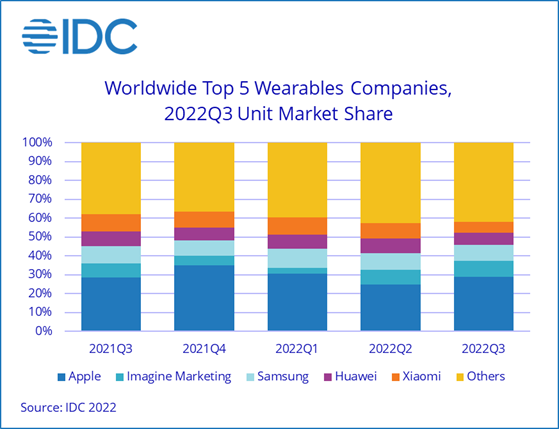 尽管该市场传统上由苹果、三星、华为和小米等科技公司主导,但随着印度国内的增长,特别是印度品牌的增长超过了世界其他地区,这一格局已经发生了变化。在2022年第三季度,前10名可穿戴设备公司中有3家来自印度,尤其是印度品牌Imagine Marketing公司跃居第二,仅次于苹果公司。