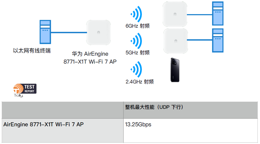 华为Wi-Fi 7之所以能做到如此的高性能,在频谱资源上,Wi-Fi 7比Wi-Fi 6增加了6GHz频段,频宽可以由原先的160MHz提升到320MHz; 在编码效率上,原先的1024QAM提升到了4096QAM; 在载波使用效率上,Wi-Fi 7可以做到一个终端同时使用2.4GHz,5GHz,6GHz等多项技术;通过这些新的技术改变,华为AirEngine 8771-X1T的理论带宽高达18.67Gbps,根据Tolly出具的“华为AirEngine 系列 Wi-Fi 6/Wi-Fi 7 线接 点性能评估和功能验证报告”显示,AP实测吞吐量也能高达13.25Gbps. 并且华为独有的动态智能变焦天线技术,可以智能的调整高密覆盖与全向覆盖模式,使无线覆盖达到最优状态,改善用户接入信号质量,进一步提升用户的接入性能和体验。