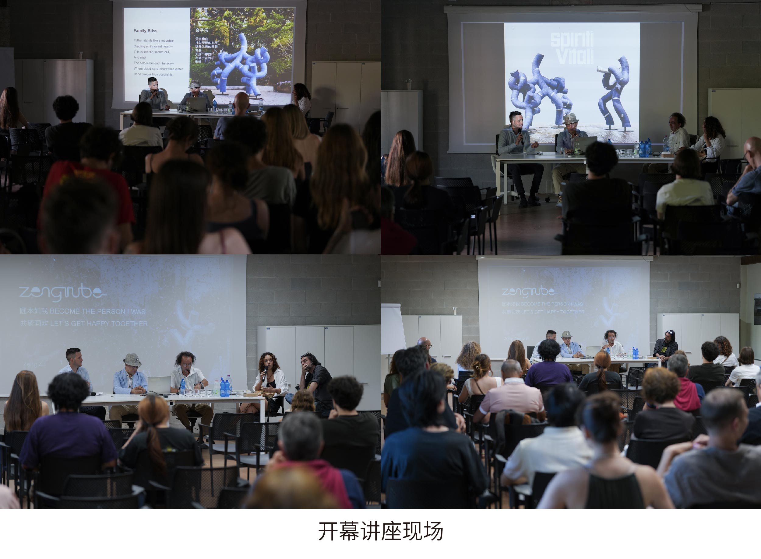 意大利当地时间7月5日17 : 30,在开幕讲座环节,曾振伟教授阐释其艺术创作观:“圆管人剥离了种族、肤色等排他性符号,用人类共通的肢体情绪语言构建普世情感纽带。”其独创的视觉符号体系,既根植于五千年东方文明底蕴,又以 “无界大爱”回应全球化语境下的文化主体性命题。