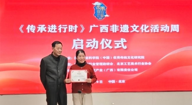 中国流通行业管理政研会副秘书长陈四海说,广西作为多民族聚居区,积淀了灿若星河的非物质文化遗产,壮锦、六堡茶、煨酒酿造、民族医药等非遗项目,是壮乡各族人民智慧的结晶,更是中华优秀传统文化的重要组成部分。此次在北京举办非遗文化活动周启动会,让广西非遗走进首都、登上更大舞台,既是展示广西文化魅力的重要契机,也为京桂两地文化交流、非遗保护经验互鉴提供了宝贵平台,希望各位传承人以此次活动为契机,讲好广西非遗故事,让更多人领略壮乡文化的独特韵味。