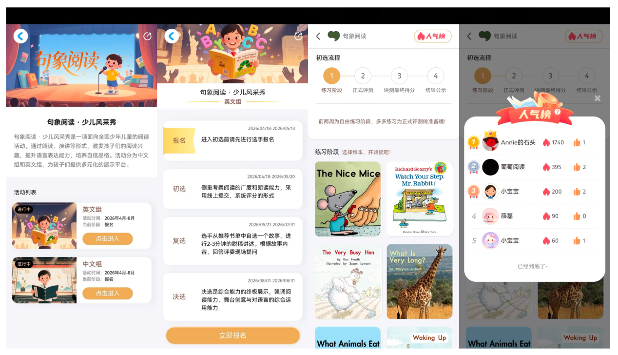 在4月23日至5月13日进行的“阅读护照”初选阶段,小选手将通过“呤阅读”App开展线上闯关活动,进行绘本朗读、跟读练习。系统将结合朗读流畅度、发音标准度、情感表达力等多维度给出综合得分,城市排名前70%的孩子将进入复选。同时设置火力值积累环节,鼓励孩子分享阅读成果、传递对阅读的热爱。