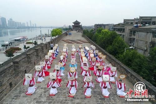 资料图:湖北省襄阳市临汉门古城墙上举办一场盛大的“开笔礼”。周政 摄