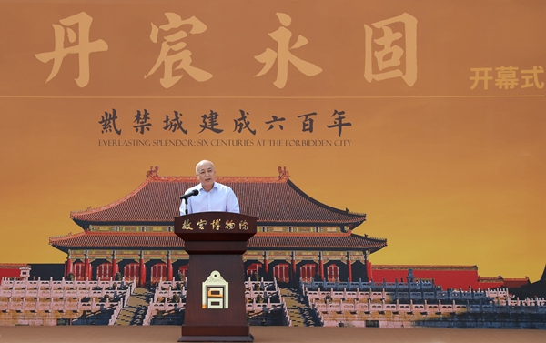 胡和平在致辞中说,故宫是中华民族文化瑰宝,是中国古代宫殿建筑集大成者,是国内收藏文物数量最多、等级最高的博物馆,是世界著名遗产地、旅游目的地。本次展览集中展示紫禁城600年建筑、艺术、文化成就和故宫博物院近年工作成果,既让人们有机会从遗产地和博物馆双重视角认识紫禁城文化价值,又能满足常态化疫情防控背景下人们的文化需求、旅游意愿。故宫博物院要坚持以习近平新时代中国特色社会主义思想为指导,立足自身定位,继往开来,不断增强为人类传承文明的责任感使命感,在保护传承中华优秀传统文化上下更大功夫,把老祖宗留下来的紫禁城、珍贵文物保存好保护好,把建筑、文物蕴涵的精神文化价值研究好阐释好,讲好中国故事,为坚定文化自信、增强国家文化软实力作出新的更大贡献。