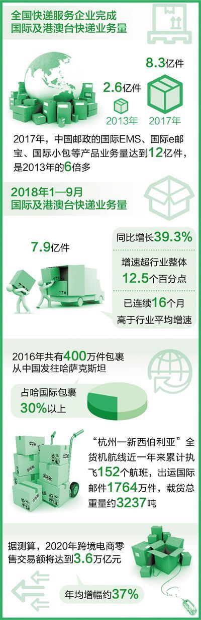 “这是一个买全球、卖全球的时代,中国的物流企业就该为这样的时代服务。”菜鸟总裁万霖说。根据国家邮政局的数据显示,2017年,全国快递服务企业完成国际及港澳台快递业务量8.3亿件,是2013年的3.2倍。今年1—9月,国际及港澳台快递业务量为7.9亿件,同比增长39.3%,增速超行业整体增速12.5个百分点,已连续16个月高于行业整体增速,成为我国快递业务增长亮点。