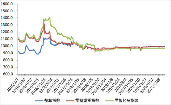 分车型看,各车型指数环比涨跌互现。其中,整车指数为989.50点,比上周回落0.09%;零担轻货指数为968.98点,比上周回升0.02%;零担重货指数为989.29点,比上周回落0.10%。