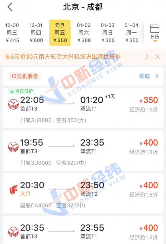 即使没有买到高铁票也没关系,中新经纬记者通过第三方售票平台发现,元旦当天,北京到多个城市的机票价格比高铁还实惠,个别航班甚至便宜超一半。