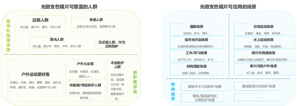 光致变色镜片作为功能性镜片的主流技术路线,可满足近视、散光、老视等各类屈光补偿的用眼需求。