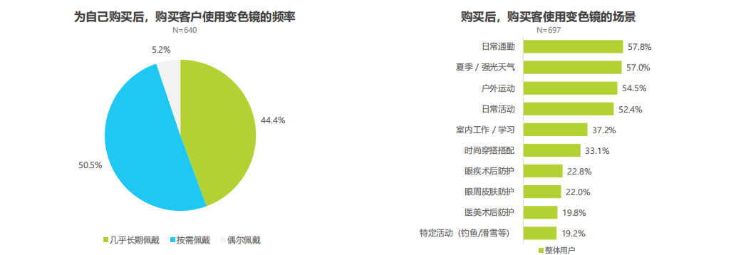 白皮书调研显示,已购买变色镜片的用户呈现出高粘性特征:约44.4%的用户几乎长期配戴,约50.5%按需配戴。日常通勤、夏季强光、户外运动是其三大高频使用场景。这意味着,一旦用户体验到其便利性,变色镜片便从功能备选真正转变为日常必备。