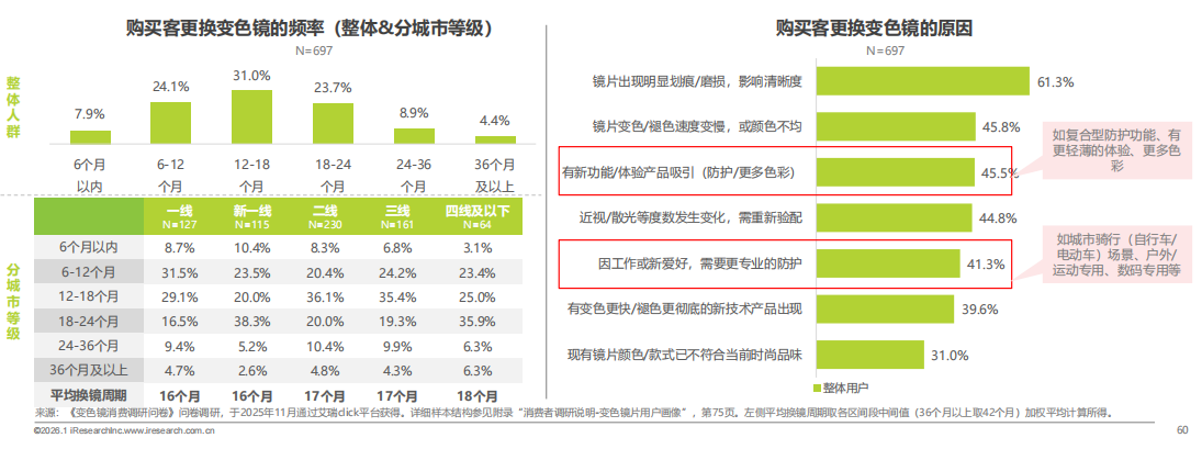 在消费行为上,变色镜片用户平均每16个月更换1次镜片,主流更换周期为12~18个月。新功能/体验吸引力(45.5%)与新场景需求(41.3%)占重要比例。