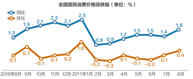 先来看CPI:8月份,同比上涨1.8%,环比上涨0.4%,同比和环比增速均创下除今年1月外的年内次高点。