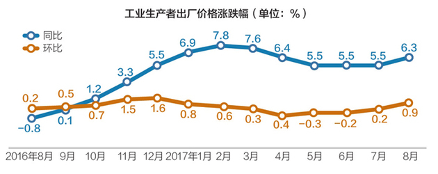 与CPI相似,新涨价因素对PPI同比涨幅的影响明显增加。8月份PPI同比6.3%的涨幅中,去年价格变动的翘尾因素约为4.4个百分点,新涨价因素约为1.9个百分点。