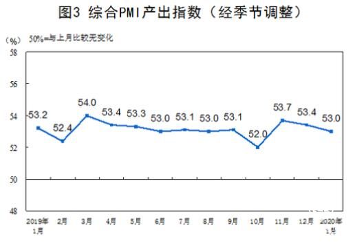截至2020年1月20日,采购经理调查结果显示, 1月份,中国制造业PMI为50.0%,非制造业商务活动指数为54.1%,综合PMI产出指数为53.0%。