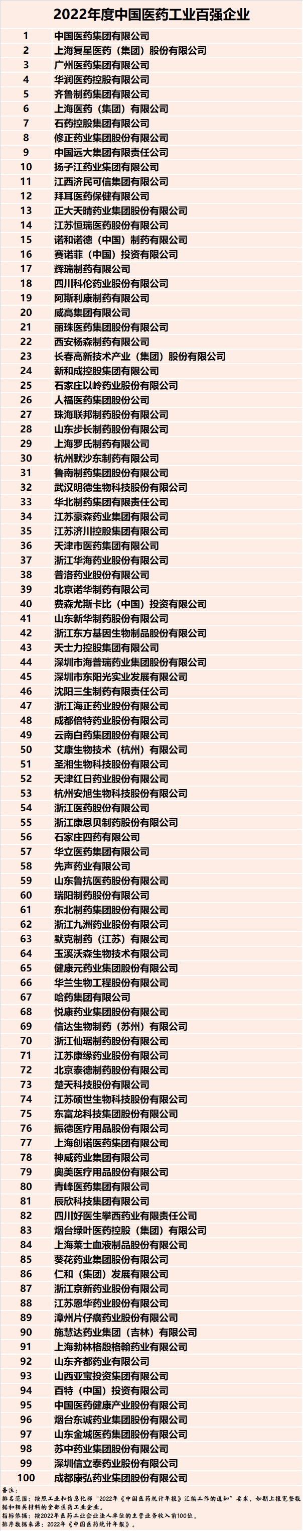 11月17日,由工业和信息化部、北京市人民政府、国家卫生健康委员会、国务院国有资产监督管理委员会、国家中医药管理局、国家药品监督管理局共同举办的“2023中国医药工业发展大会”在北京开幕。“第40届全国医药工业信息年会暨2022年度中国医药工业百强论坛”于11月18日在会期举办,会上发布了备受行业关注的2022年度中国医药工业百强榜单。中国医药集团有限公司、上海复星医药(集团)股份有限公司、广州医药集团有限公司位列前三甲。