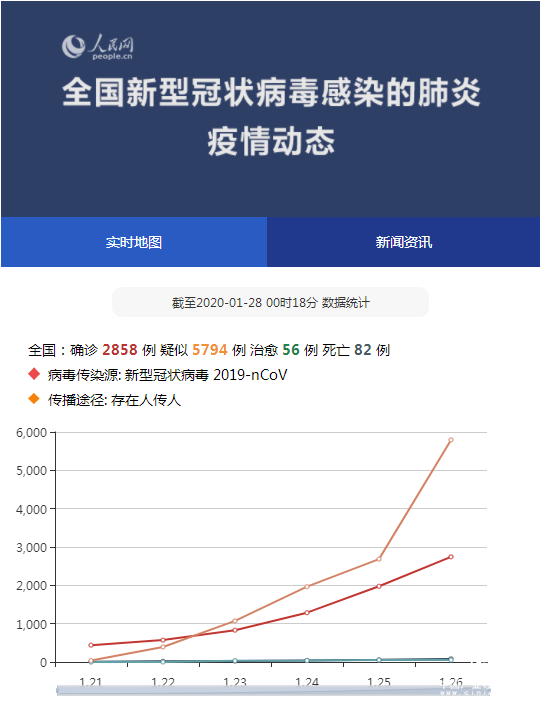 实时疫情:全国确诊2858例 疑似5794例 治愈56例 死亡82例