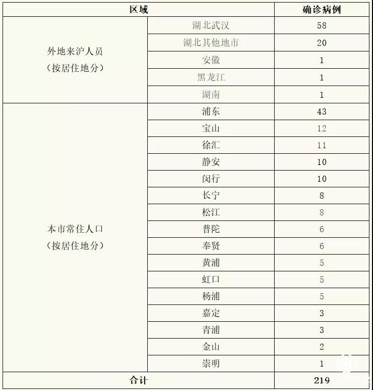 截至2月4日12时,上海市已累计排除疑似病例527例,发现确诊病例219例。确诊病例中,男性112例,女性107例;年龄最大88岁,最小7月龄;121例有湖北居住或旅行史,8例有湖北以外地区居住或旅行史,90例有相关病例接触史;外地来沪人员81例,本市常住人口138例。具体情况如下: