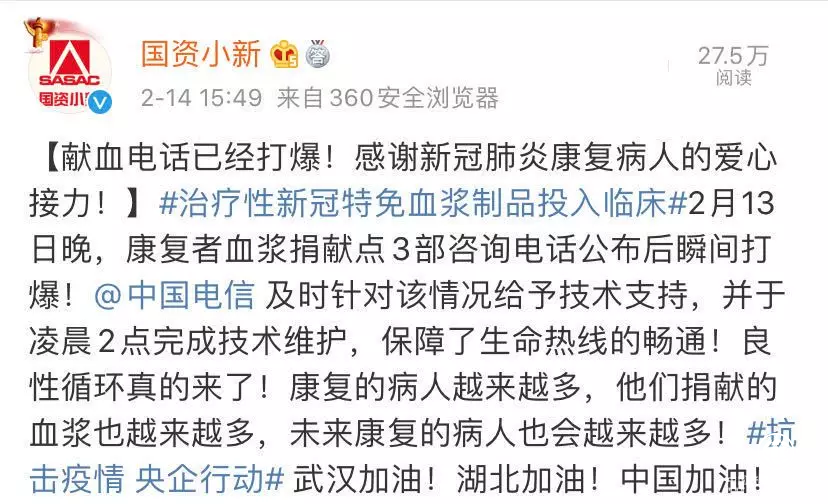 近两日,全国各地不断传来康复患者主动捐献血浆的消息,据@国资小新消息,咨询电话公布当晚被瞬间打爆: