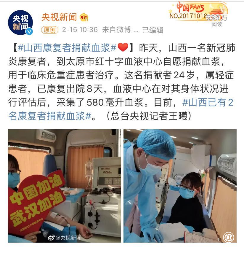 2月4日下午,武汉市江夏区中医医院院长熊侃在微信群里发起捐献倡议:新冠肺炎治愈患者的血浆可能含有抗体,输入重症患者血液中能挽救他们的生命。