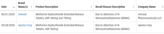 据FDA官网,Apotex Corp和Amneal Pharmaceuticals LLC两家企业已分别于5月28日和6月1日召回盐酸二甲双胍缓释片。其中,Amneal Pharmaceuticals LLC召回的盐酸二甲双胍缓释片规格为500mg和750mg,Apotex Corp召回的盐酸二甲双胍缓释片规格为500mg,召回原因同一为检测到NDMA。