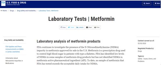 此前,鉴于一些降压药和胃药中曾检测出NDMA超标,自2019年起,FDA就曾对二甲双胍中是否含有NDMA、NDMA是否超过每日可接受摄入量限制进行调查。今年3月2日,FDA发文称,将FDA继续调查已批准在美国销售的二甲双胍中是否存在NDMA,FDA已在一些二甲双胍药物产品样品中鉴定出低水平的NDMA,但尚未在二甲双胍活性药物成分(API)中鉴定出NDMA,迄今为止,FDA测试的二甲双胍样品均未超过NDMA可接受的每日摄入量。