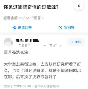 2019年8月16日,有网友在知乎平台留言,大学室友因蓝月亮洗衣液过敏,去皮肤研究所检查了部分过敏源,均未发现为何过敏,但更换洗衣液后恢复正常。