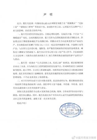 面对网上诸多质疑,蓝月亮(中国)官方微博3月13日曾发布声明称,目前公司经营状况良好,无裁员计划,不存在“大规模裁员”。公司员工的离职流程,均按照规定处理,不存在无故克扣工资的情况。此次别有用心的人发布的蓝月亮“变相裁员”“克扣工资”“强制员工销售”等恶意中伤、诽谤的不实言论,公司将保留采取一切法律手段追责的权利。