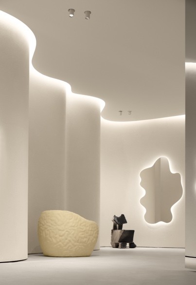 新居里陈列着几件艺术品家具,与Acne Studios纽约旗舰店同源出自英国艺术家Max Lamb。洞穴客厅的主题与这位石器时代迷异常契合,几件家具雕刻着被时光打磨出的朴拙痕迹,与洞穴的自然肌理感一脉相承。观夏与松美术馆的联名款香薰静静地摆放在外形如同素奶油堆砌的艺术茶几上,还有几本“Summer“私藏的艺术书刊。客人在这里闻香阅读、放松思考,在呼吸之间得安宁一度。