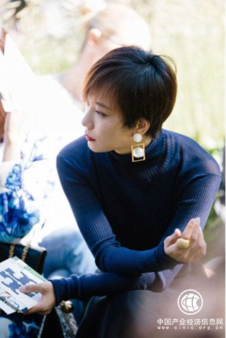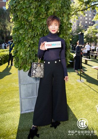 王珞丹的半透明蓝色高领上衣搭配黑色阔腿裤,短发造型利落中带着优雅,与ToryBurch动感的品牌调性十分相符。