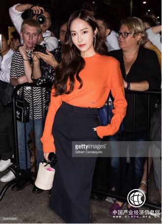 橘色上衣搭配黑色收腿长群,加上神秘迷人的微笑,在耀眼的闪光灯下也毫无破绽。