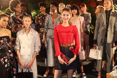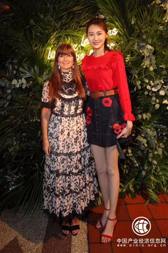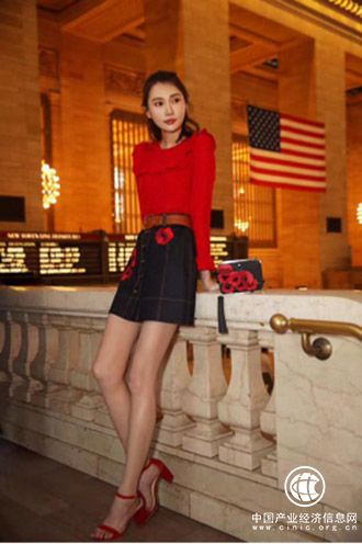 李斯羽身穿一抹亮红荷叶边短上衣,搭配罂粟花刺绣的短裙和手包,和KATESPADE本季的花朵元素格外匹配。