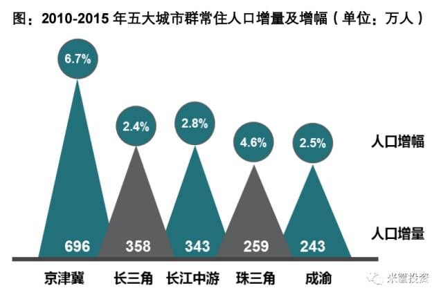 从人口增量来看,京津冀城市群受益于北京、天津两大城市人口的快速增长,五年常住人口增加近700万,人口凝聚力居首;珠三角城市虽然面临制造业向内陆转移的压力,但2015年人口规模相对2010年仍增长4.6%,人口吸引力突出。