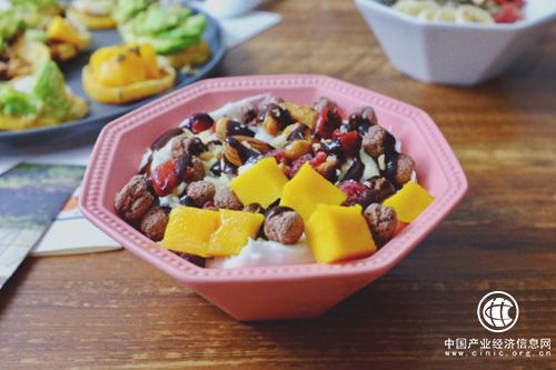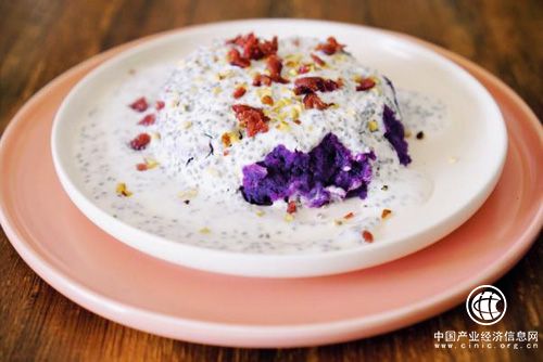 ②、奇亚籽+酸奶混合,倒在紫薯上,撒少许坚果碎和蔓越莓干