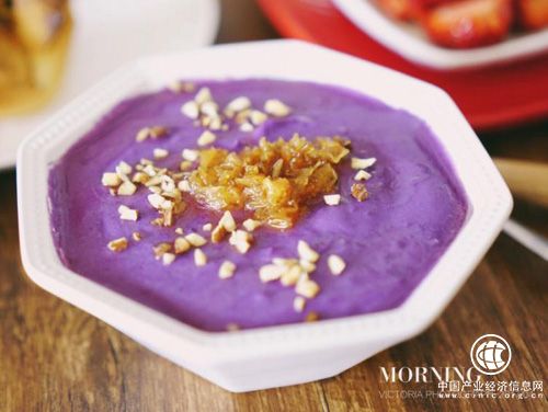 ①、紫薯去皮切成块,蒸熟后加蜂蜜用料理机打成泥,放在盘子上