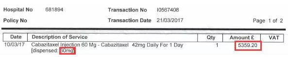 还有一种前列腺癌的常见化疗药物卡巴他赛,国内同样没有上市,有的患者曾经尝试到香港去购买。其实,如果直接到英国去治疗,这种药物的价格比香港还低。英国60mg卡巴他赛的价格是5359.20英镑(下图红线标注),折合人民币47563元;而香港的价格约53000人民币,比英国要高。