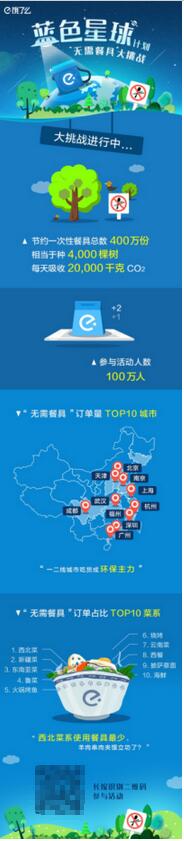 10月31日,饿了么发布“环保挑战赛”阶段性数据:从10月10日活动开始至今,平台累计节约一次性餐具总数已超过400万份,参与活动人数也达到100万。按原定计划,在11月10日前,如用户节约一次性餐具累计达到500万份,饿了么将按每1000次=1棵树的标准,为中国荒漠化地区种植树木。