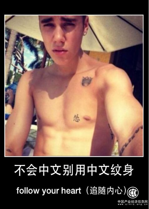 这位1994年出生的加拿大歌手,各种得瑟地晒了自己文的汉字文身“怂”,还一本正经地解释:这是遵从内心的意思。