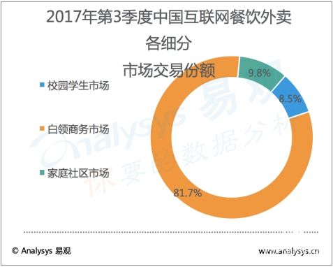 从整体市场看,在线外卖市场已经连续两个季度同比增幅达8成。此前,易观发布的2017年第2季度互联网餐饮市场报告显示,互联网餐饮外卖整体交易规模达459.5亿元人民币,同比增幅达81%。分析认为,当前外卖已成为O2O体量最大、价值最高的细分领域,但仍保持较高速度增长,不同于出行、票务等红海领域,外卖仍然有非常大的增长空间。