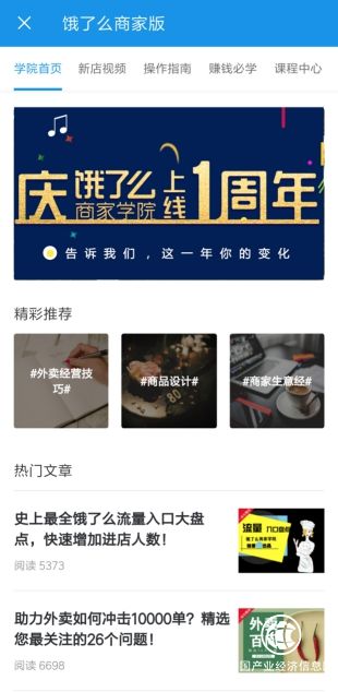 说了这么多,饿了么商家学院,到底是个什么组织?原来,这是饿了么旗下的一个教育培训部门,通过整合平台内外及行业资源,为全国外卖从业者提供线上线下多元化的学习平台。目前,饿了么商家学院提供了多种学习渠道:napos(饿了么商家版)商家学院模块、饿了么商家学院微信公众号、课程直播、商家服务日等。