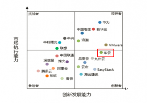 2016-2017年私有云市场各品牌竞争力分析象限,华云在创新者行列中名列前茅