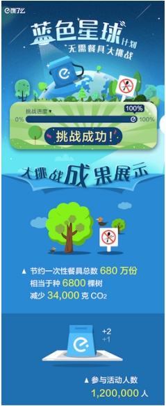 大家还记得饿了么“环保挑战赛”活动吗?只要你在下单时选择“无需餐具”,当次数累计达到500万次时,饿了么就会为你种树。11月14日,饿了么公布了“环保挑战赛”的活动结果:从10月10日到11月10日,平台累计节约一次性餐具总数已超过680万份,参与活动人数也达到120万。按照原定每1000次=1棵树的计划,饿了么将种植6800棵树木,相当于减少了34000克二氧化碳的排放。