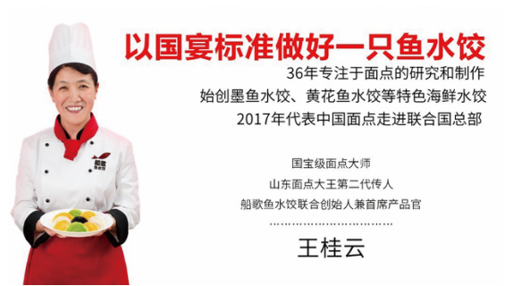 船歌鱼水饺产品技术源自于国宝级面点大师两代家传,联合创始人兼首席产品官王桂云是国宝级面点大师,山东面点大王第二代传人,36年专注于面点的研究和制作,以国宴标准做好一只鱼水饺,始创墨鱼水饺、黄花鱼水饺等特色海鲜水饺,2017年代表中国面点走进联合国总部,传播传统美食文化。