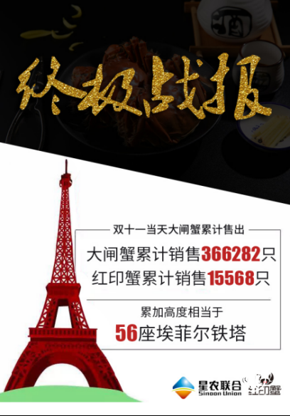 双十一购物节的大戏已经落下帷幕,截止到2017年11月12日0时,天猫双11全网总成交额为1682亿元,再创纪录!生鲜品类作为每年双11的消费热点之一,也是捷报频频。星农联合双11当天累计销售额突破千万,其中大闸蟹累计售出366282只,领跑大闸蟹行业。“红印蟹”品牌创立后的第一个双11,以黑马之姿,凭借高客单价,领跑大闸蟹品牌。作为全新打造的品牌,数据显示红印蟹头1小时就售出5640只,全天累计售出15568只,“锋味”红印蟹也风头正盛,全天累计售出超过6000只。