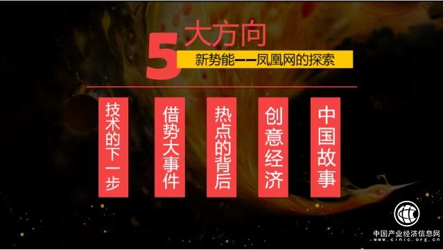 在对新技术、新形式、新内容有了全面的阐释后,郝炜为大家展示了凤凰网探索的五大创新方向。分别是技术的下一步、借势大事件、热点的背后、创意经济和中国故事。技术的下一步是指"品牌程序化",凤凰网通过推出人工智能+人文关怀的凤翼程序化广告平台,整合最优质的媒体资源,不仅将广告展现给用户,更是精心设计品牌场景,精准传递品牌的力量,把广告主的品牌价值更好的传递给每一位用户;借势大事件指的是凤凰网的"大事件营销",凤凰网书写着不可复制的"超级影响";热点的背后指的是凤凰网的"热点营销",通过"凤眼"系统及专业编辑的新闻敏感性互相配合,使得凤凰网能够迅速捕捉社会热点;创意经济指的是凤凰网的"社会设计",通过将社会问题进行再发现和再定义,通过创意的方式形成解决方案,最后产生新的沟通内容、产品跟服务;"中国故事"则展示了凤凰网希望搭建起一个提供服务、分享经验的平台,用技术的创新、匠心精神、用心沟通,为中国品牌走出去提供可能,为全球品牌到达中国提供新的服务。