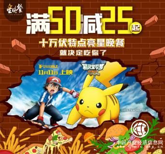 饿了么看准《精灵宝可梦》在国内上映的时机,巧妙将这次IP与自身的#欢乐星晚餐#结合,在11月13~17日打造“十万伏特点亮星晚餐”,以皮卡丘的活泼可爱形象和“满50减25起”超值优惠为晚餐场景增添欢乐幸福感,也给大家饥饿的胃充满电。
