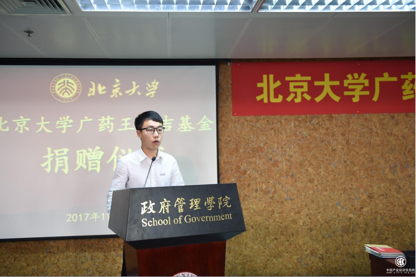 北京大学学生会主席、工学院2014级本科生孙北奇作为学生代表感谢广药集团对青年一辈的关怀和对国家教育事业发展的高度支持。他相信基金的设立将助力北大学子成长成才,开拓学生的国际视野,推进校园活动的顺利开展,全面提高学生的综合素质,为国家发展培育高素质的人才。